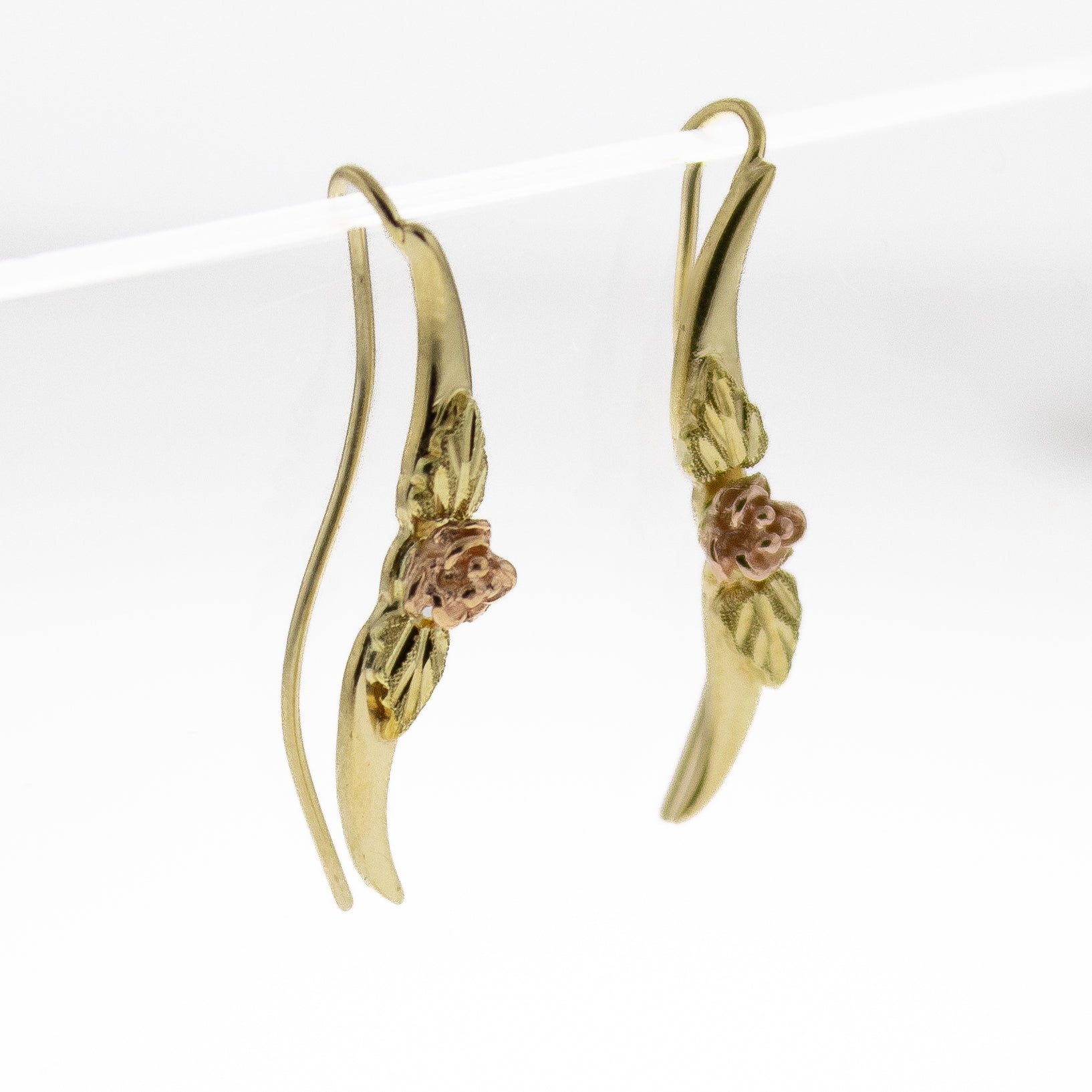 These delicate 14K gold, drop earrings showcase the timeless beauty of Black Hills gold. Featuring an elegant rose detail that adds a touch of romance and threader-style post, offering a comfortable, understated look. These earrings weigh 2 grams total.