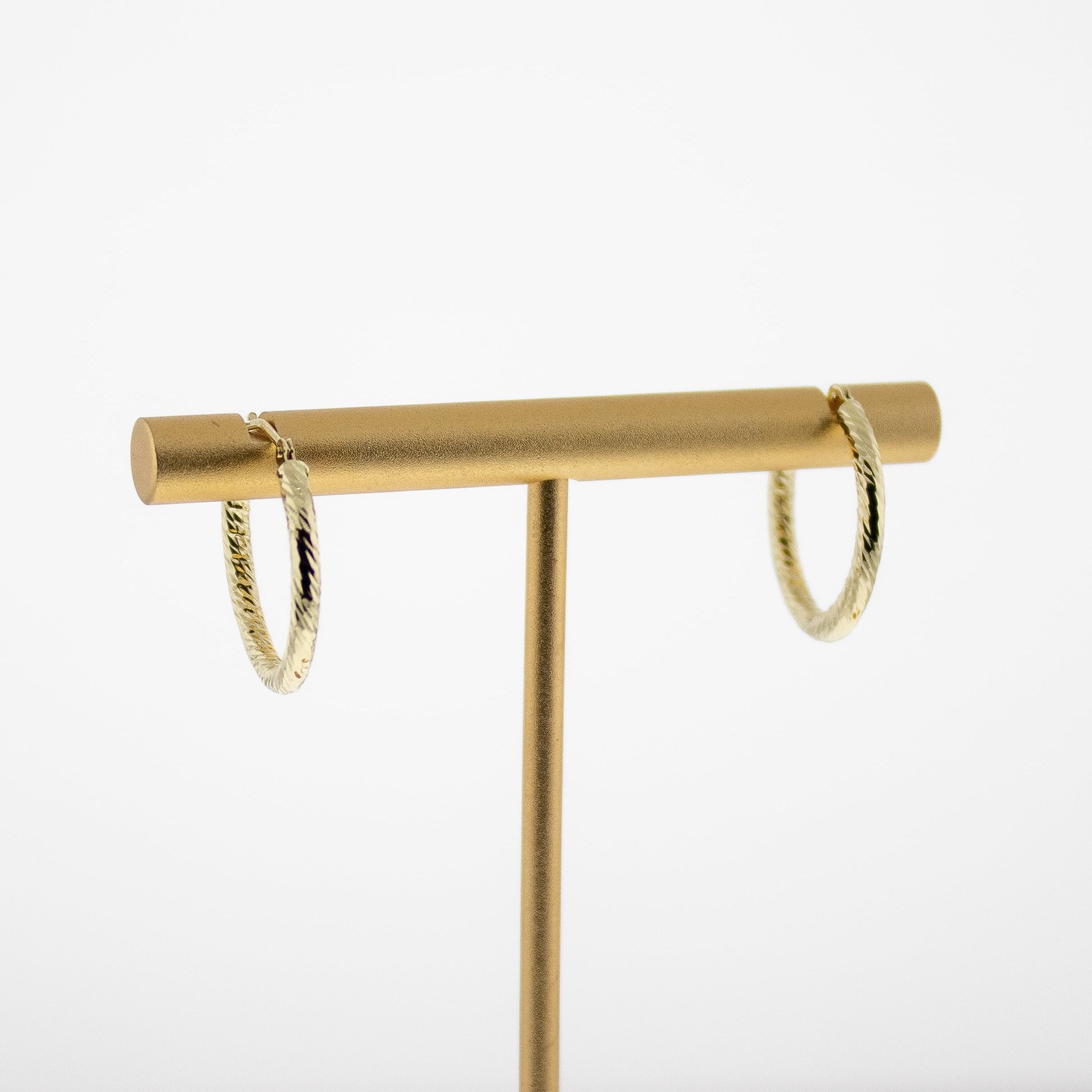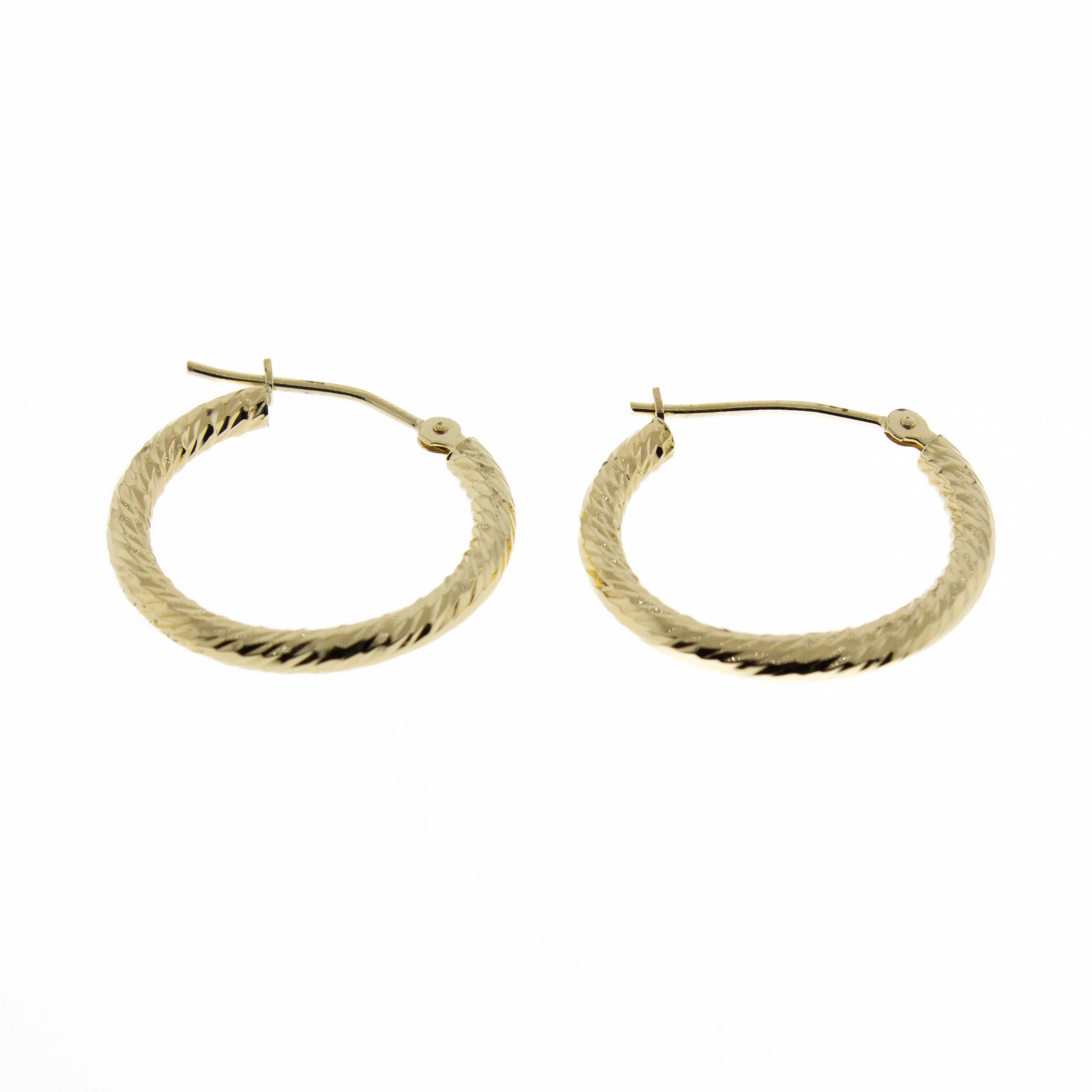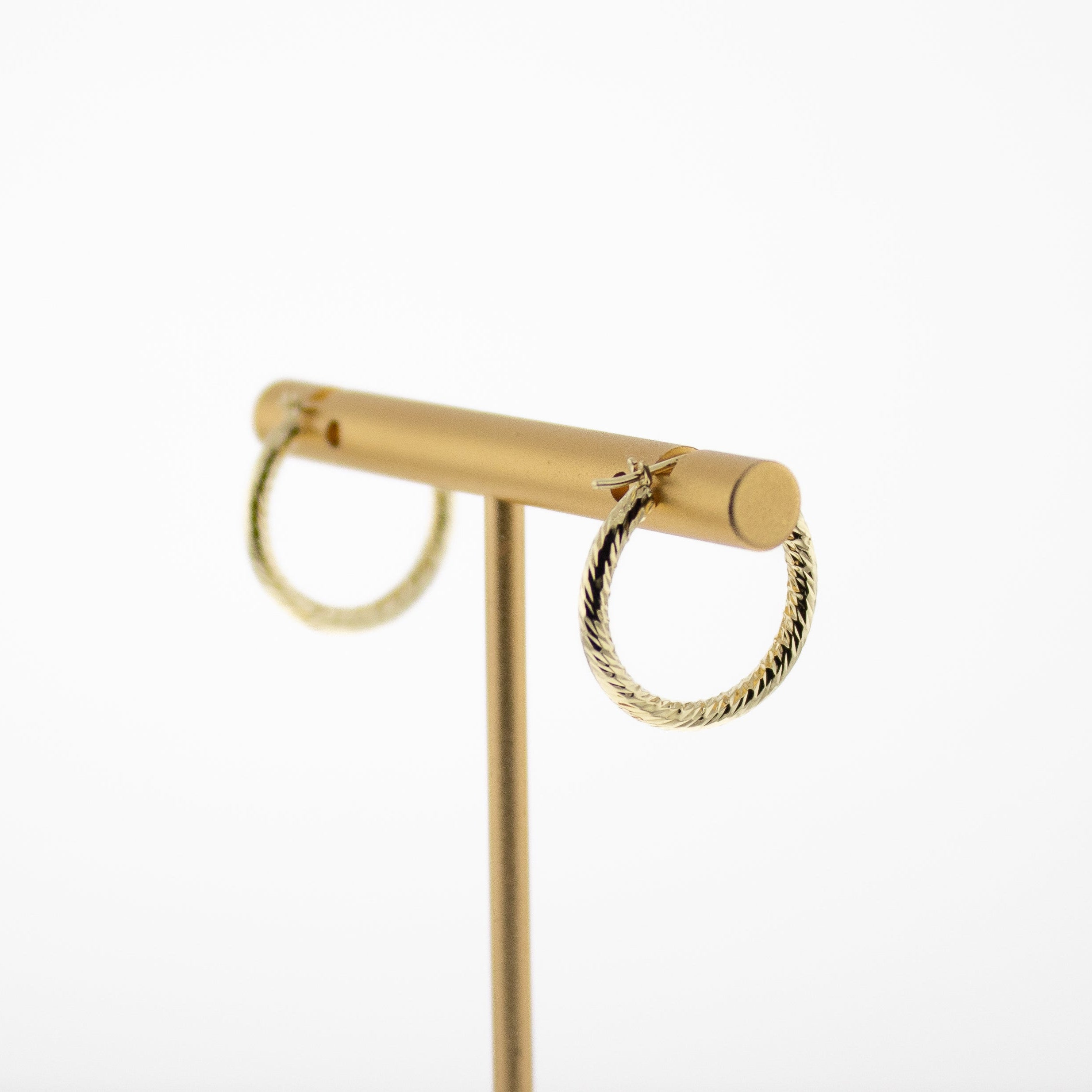 Elegant 14K yellow gold hoops featuring a beautiful mix of textured and polished surfaces. These petite 19mm hoops showcase classic design with a secure latch closure, making them perfect for everyday wear or special occasions. Lightweight at just 0.7 grams, they offer comfortable all-day wearability! A timeless addition to any jewelry collection.