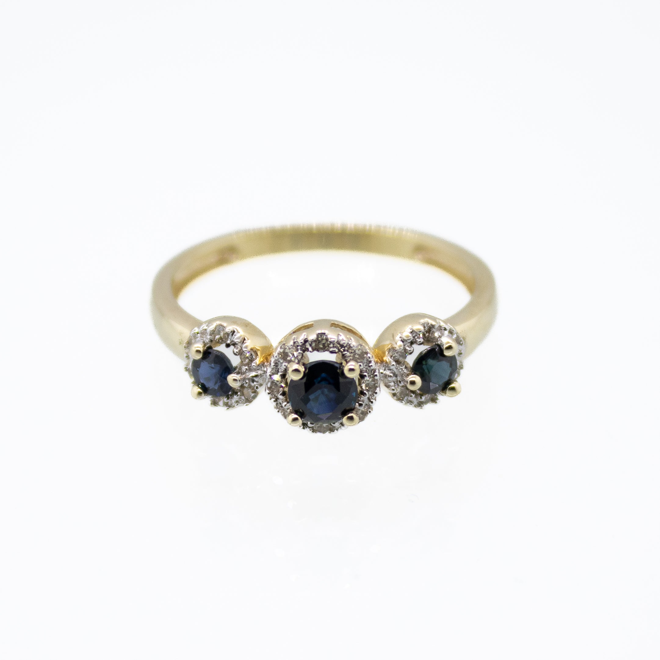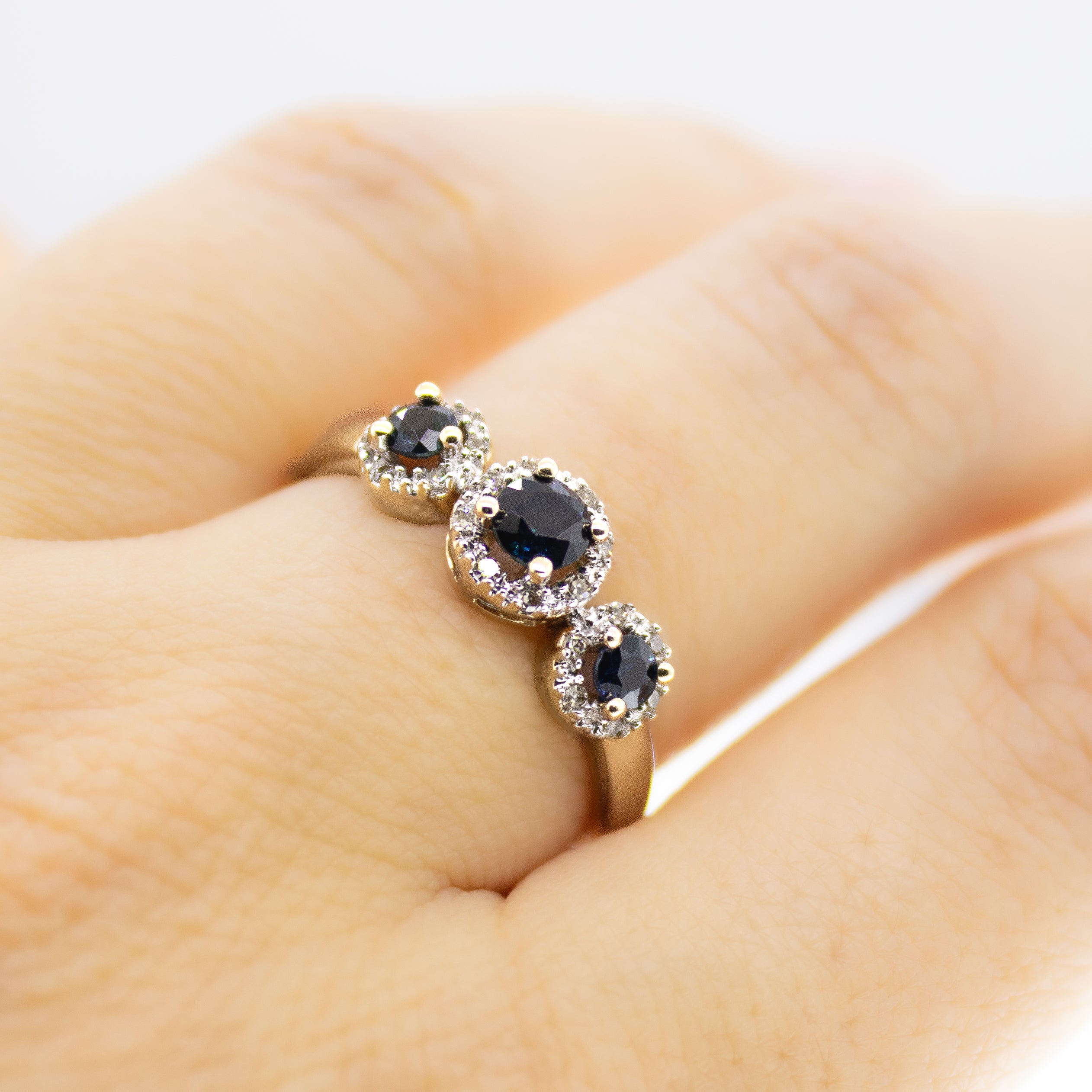 This 14K yellow gold ring features a three beautiful round natural sapphires, each surrounded by a diamond halo that adds extra sparkle. The dainty band makes it comfortable to wear every day, while the brilliant diamonds and rich sapphire ensure it catches the light beautifully. This ring weighs 2.4 grams.
