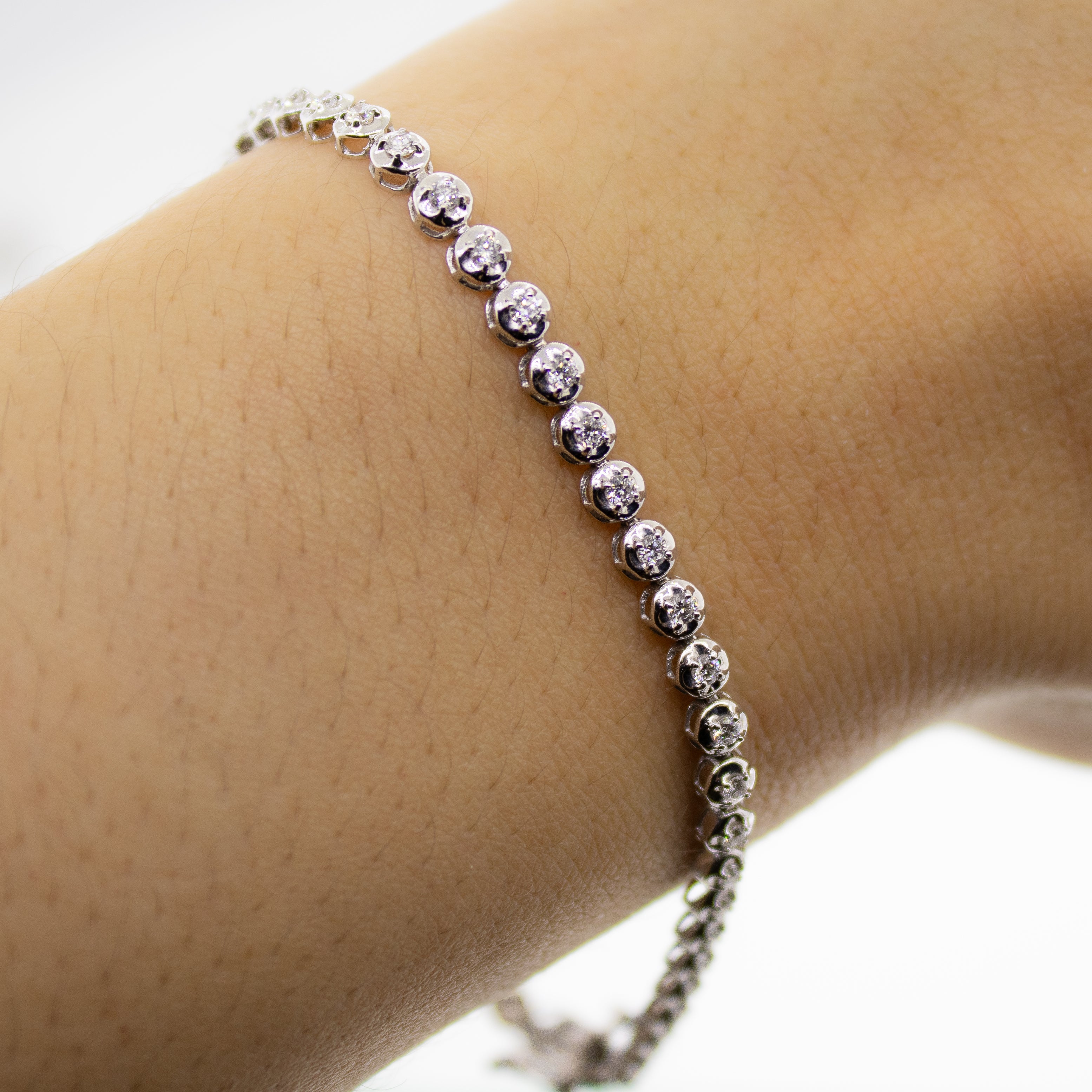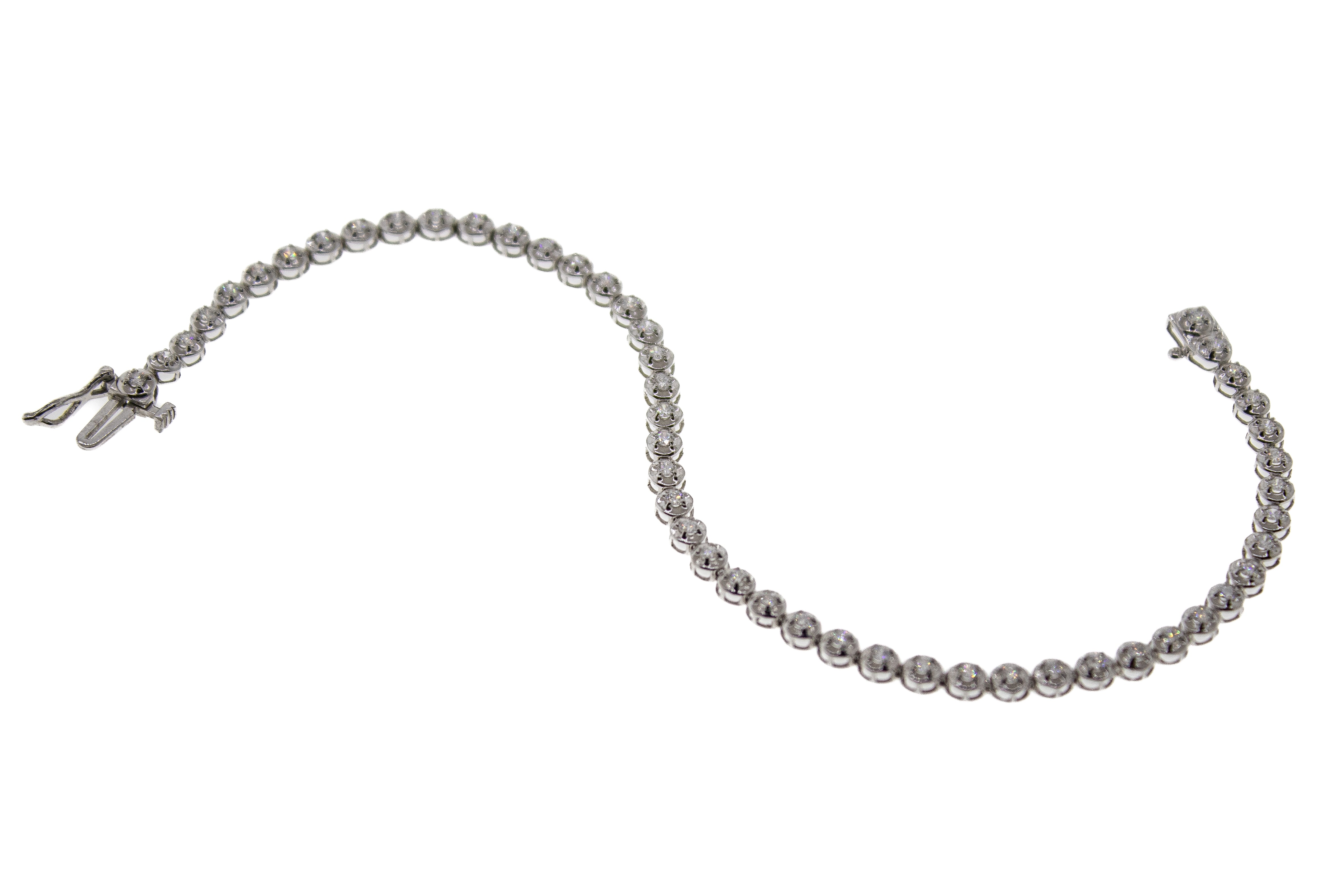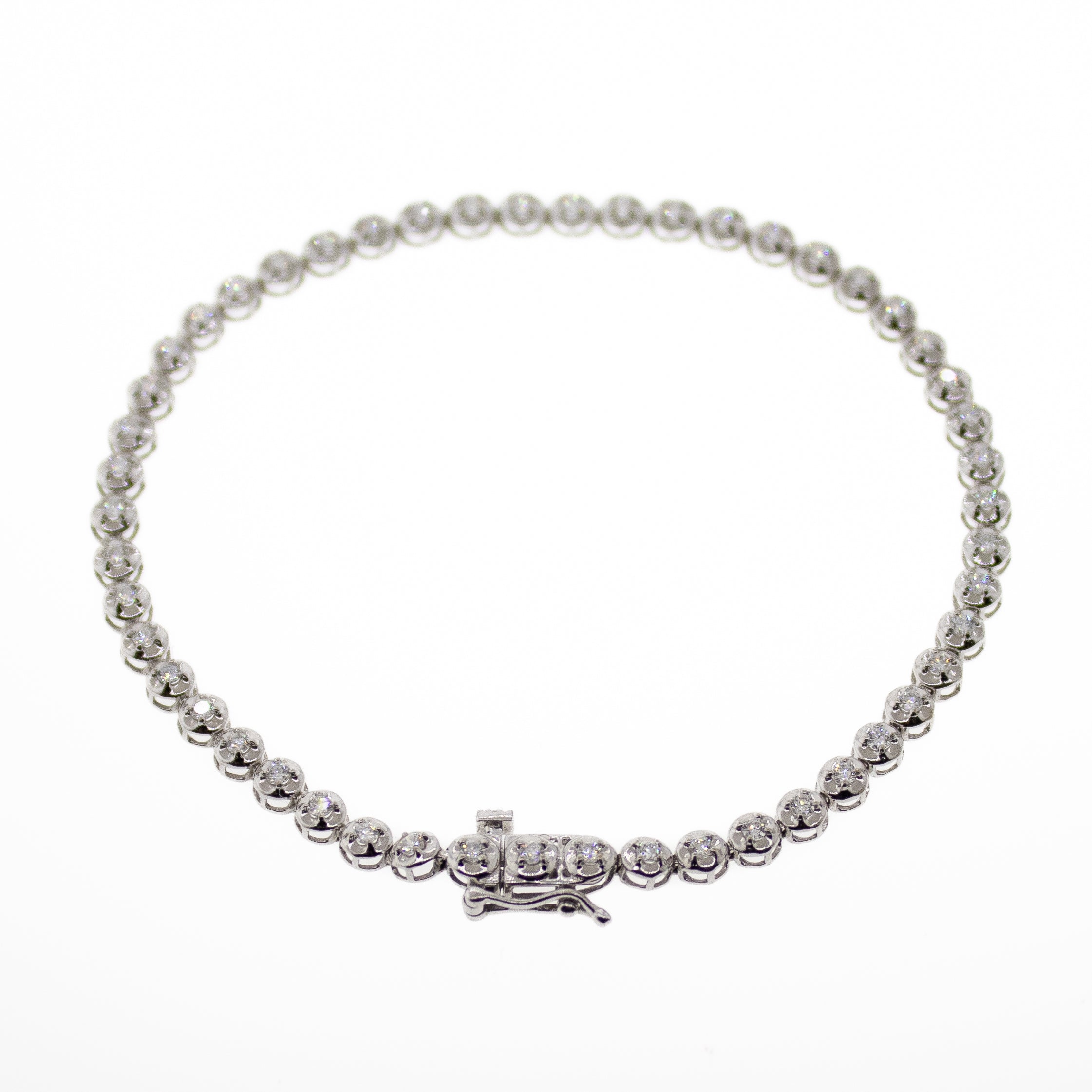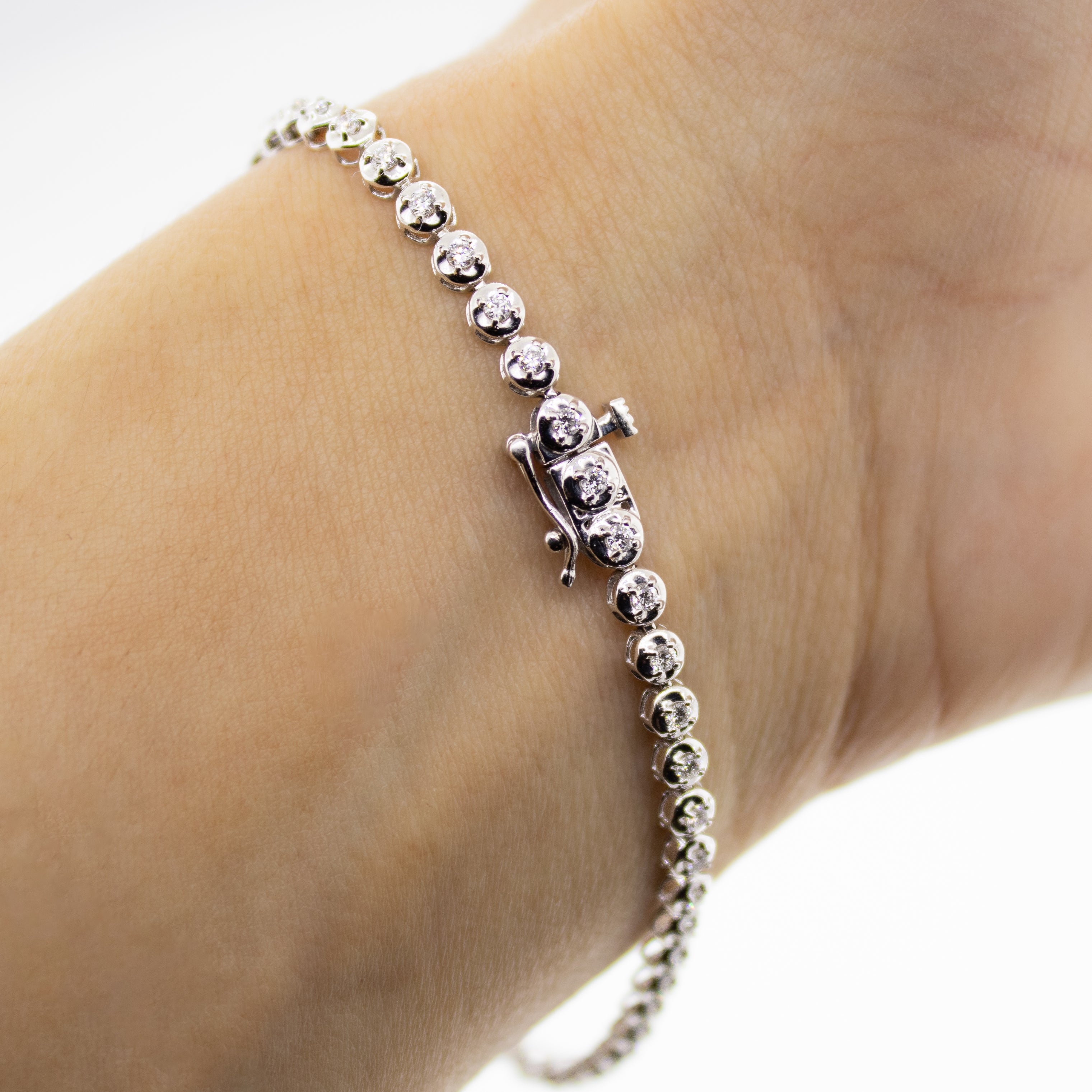 A classic diamond tennis bracelet in 10-karat white gold. Natural diamonds are set along the length of the bracelet for a clean, timeless look. The piece weighs 3.8 grams and features a box clasp with an additional figure-8 safety clasp to keep it secure on your wrist. Perfect for everyday wear or special occasions.