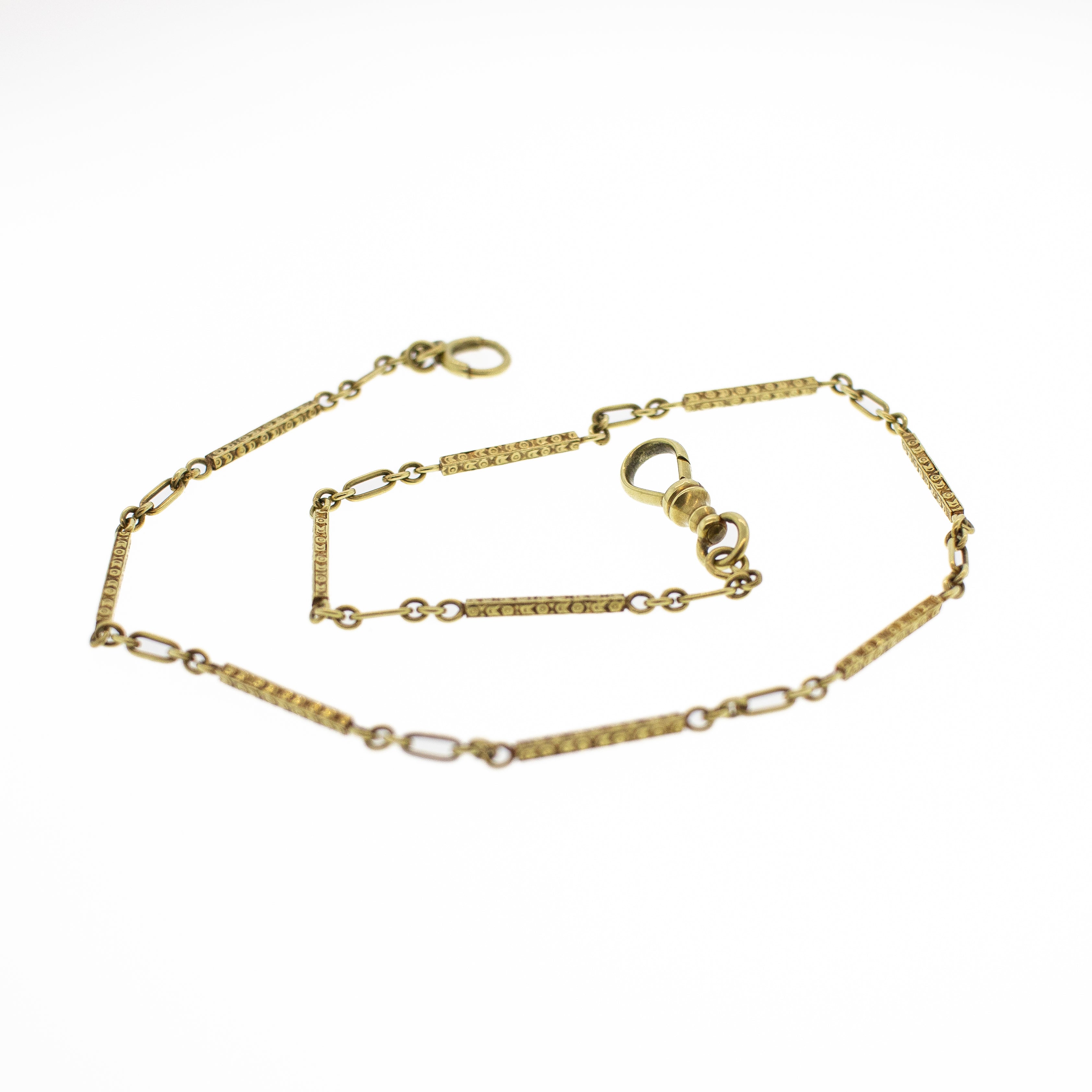 This exquisite 14K yellow gold pocket watch chain captures the elegance of the Victorian era with its intricately carved link details. Measuring 13.75 inches, it's perfectly proportioned for secure attachment and display. This piece combines authentic craftsmanship with timeless sophistication—ideal for collectors or those seeking a refined vintage accessory. Weighs 8.8 grams of 14 karat, yellow gold.