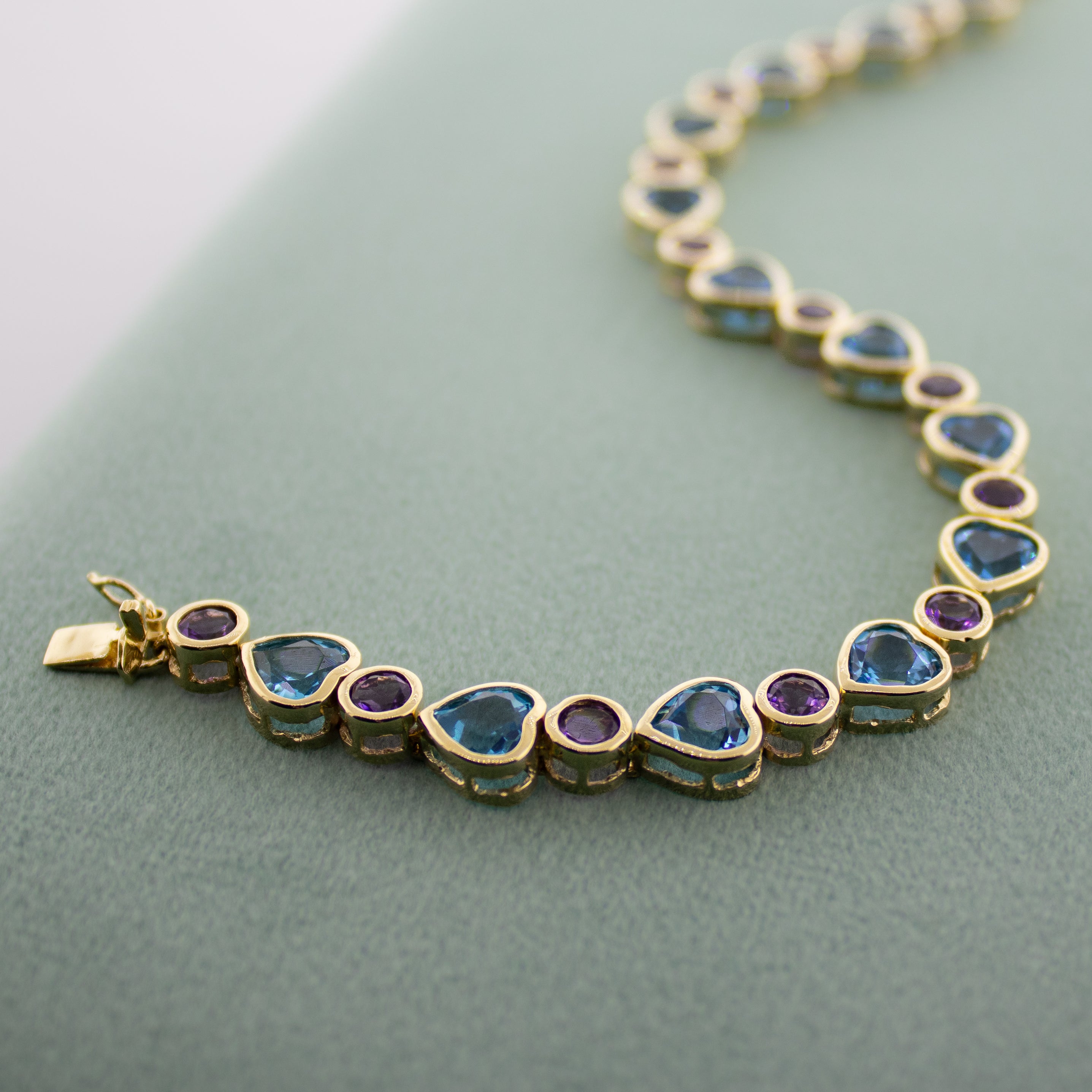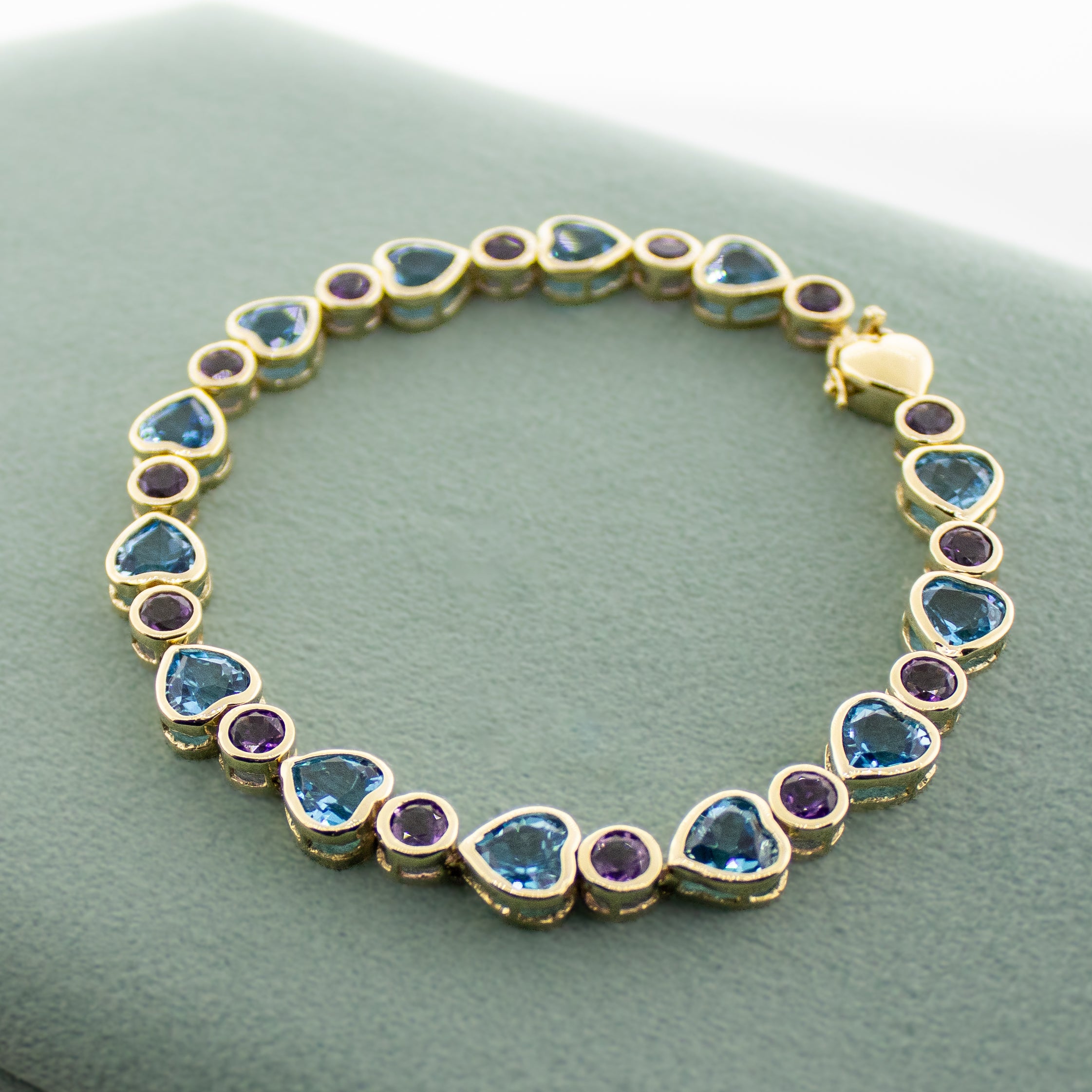 This charming bracelet showcases heart-shaped blue topaz and round amethyst, set in a 14K yellow gold bezel. Whether you're drawn to its romantic heart motif or beautiful blend of colors, this bracelet brings a touch of whimsy and elegance to any jewelry collection. A sweet choice for gemstone lovers! This bracelet weighs 12.5 grams.