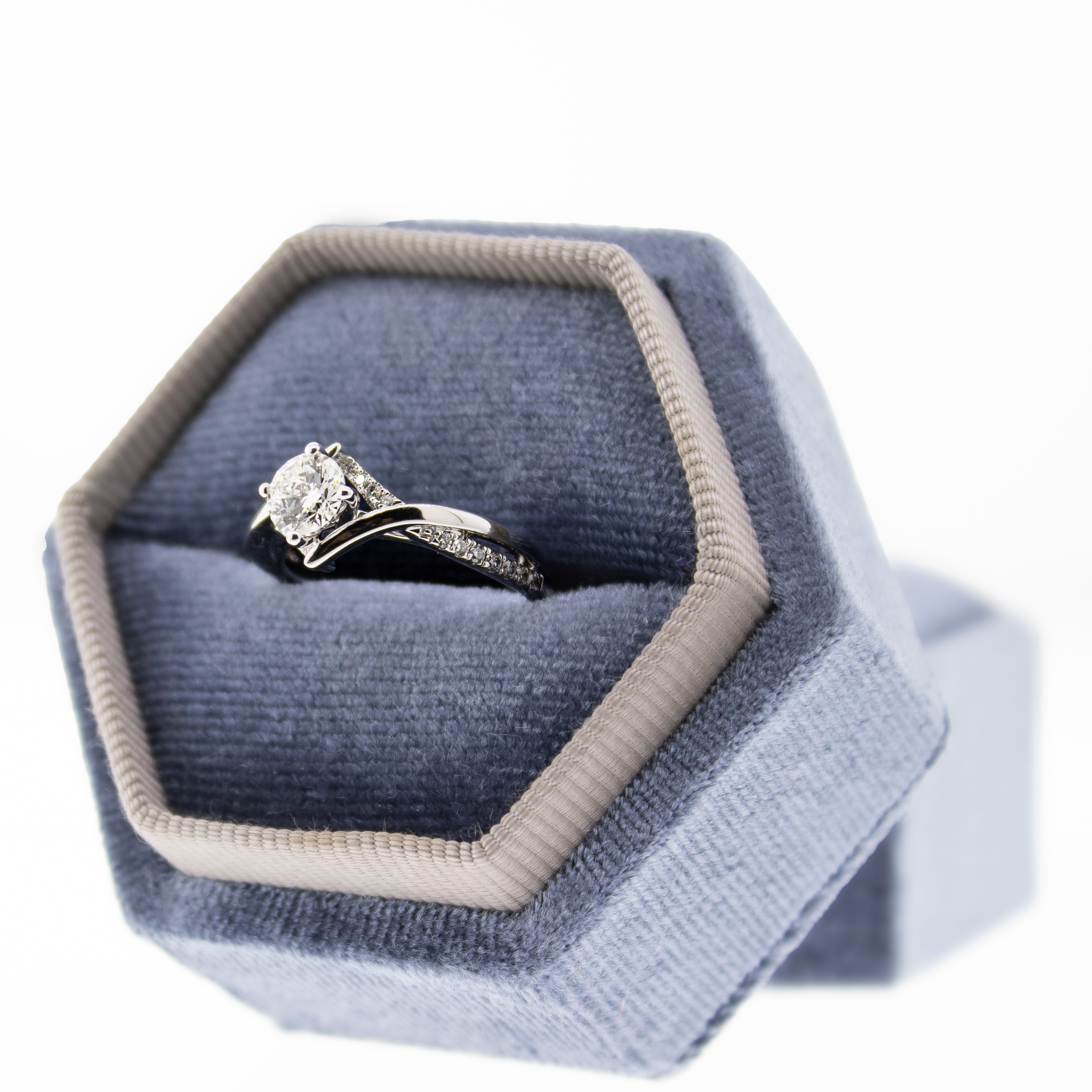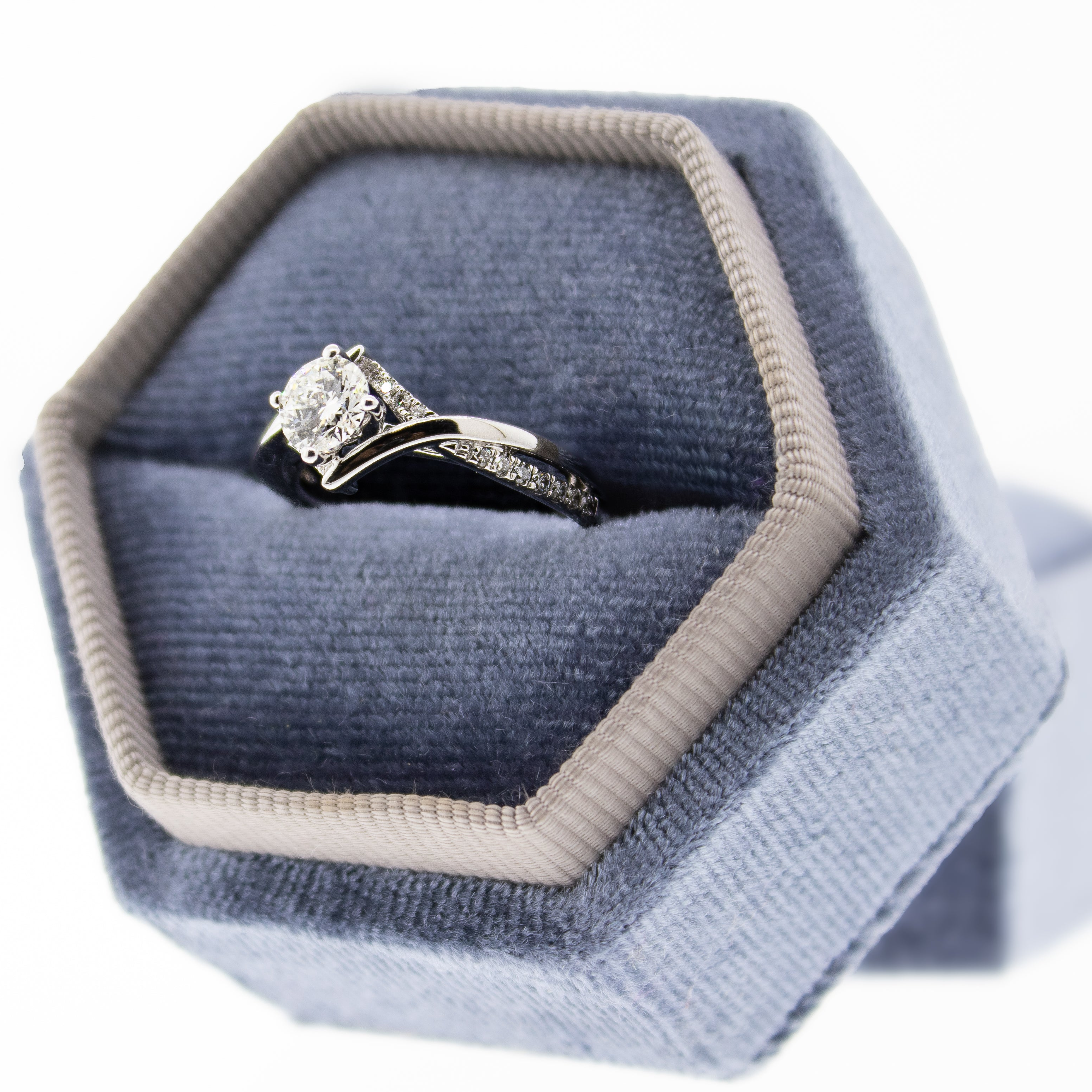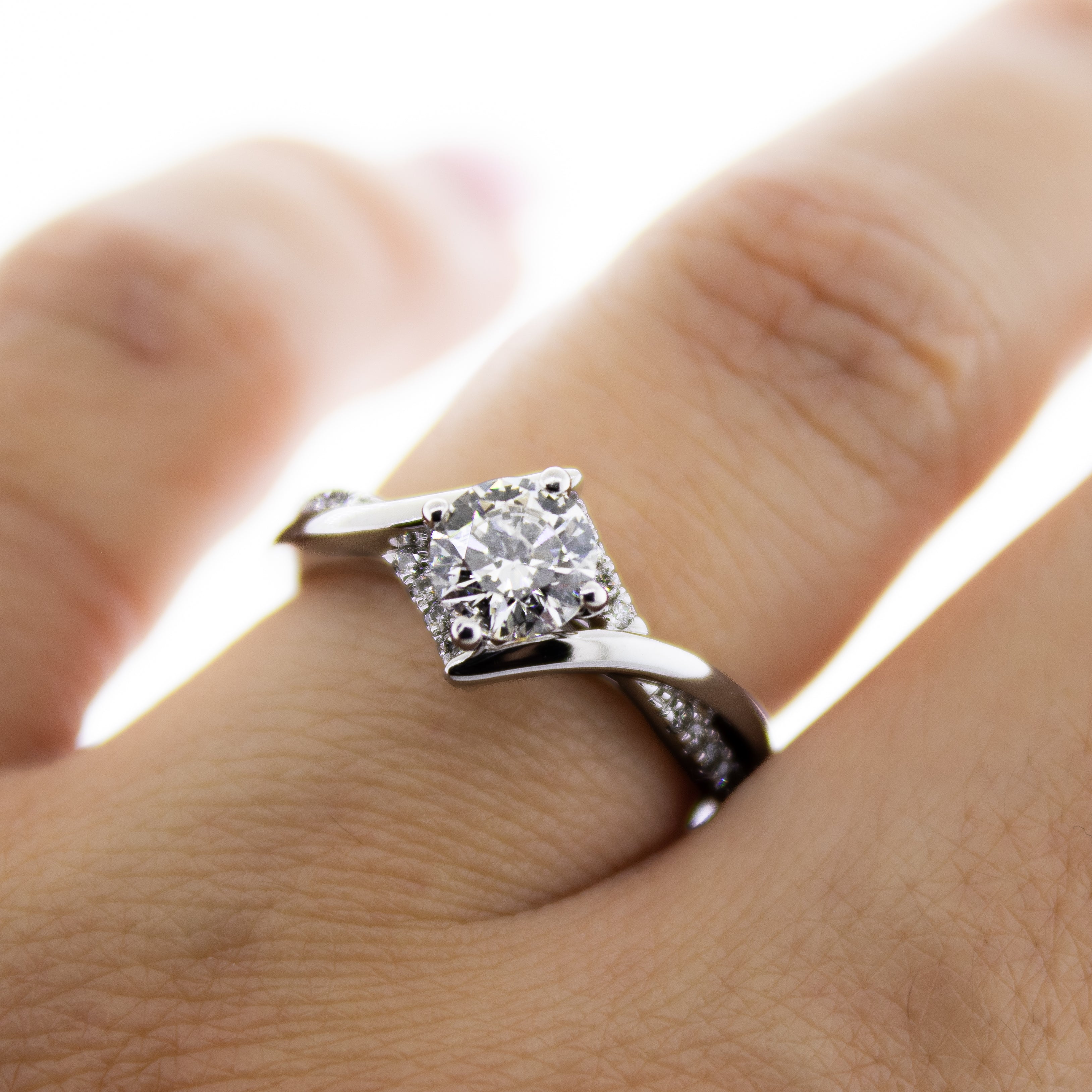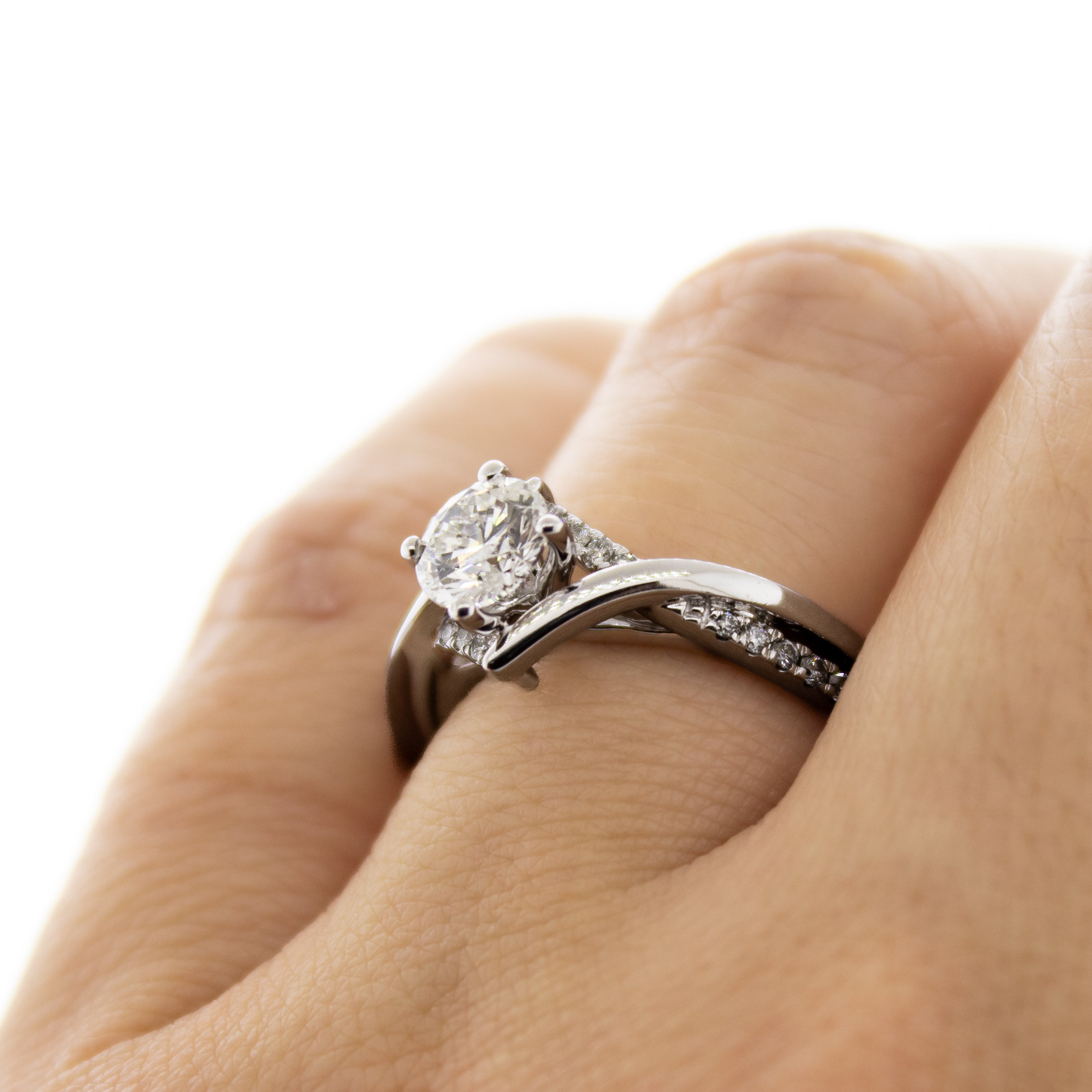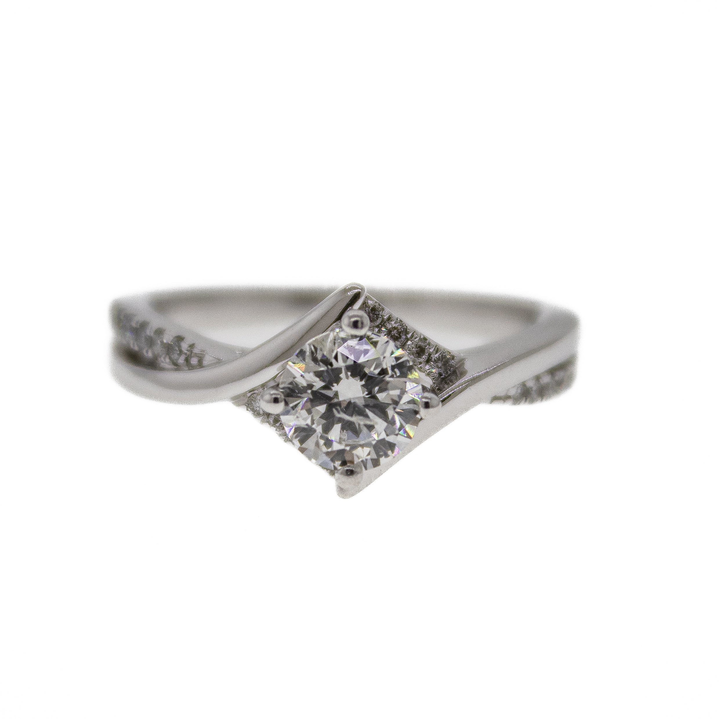 Celebrate your love story with this beautiful White Gold Engagement Ring. At its heart sits a radiant 0.72 Carat, round brilliant diamond in F color with I1 clarity. The graceful twisted diamond shank wraps around the band, creating an enchanting style of light and sparkle. This ring is designed to be worn and cherished for a lifetime of special moments together.